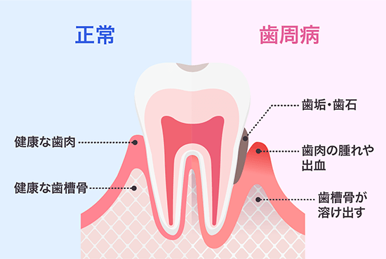 TVCMなどの影響で、歯周病は歯茎の病気と思い込んでいる患者様もいらっしゃいますが、実際は歯槽骨(歯を支えている骨)が溶けてしまう病気のことを指しています。